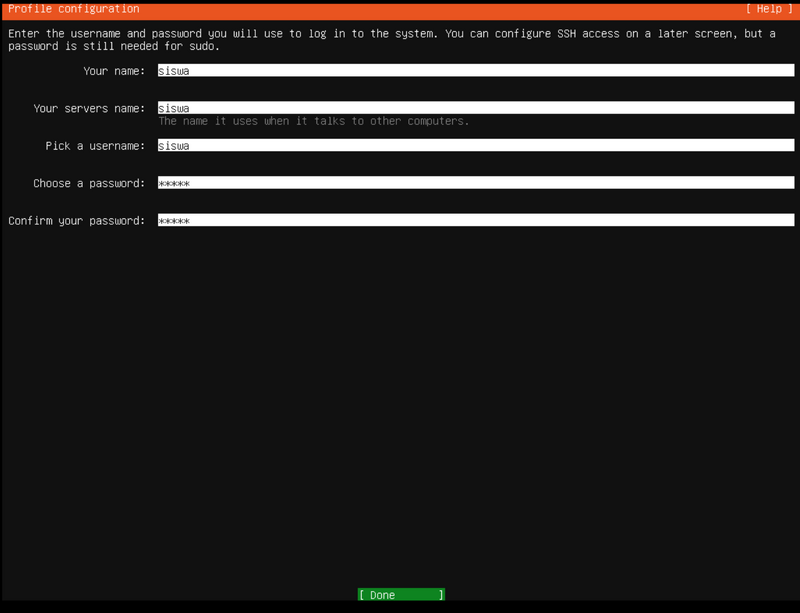 Pada tahap beikutnya adalah konfigurasi profil pengguna Ubuntu server, silakan disesuaikan menurut kebutuhan masing-masing