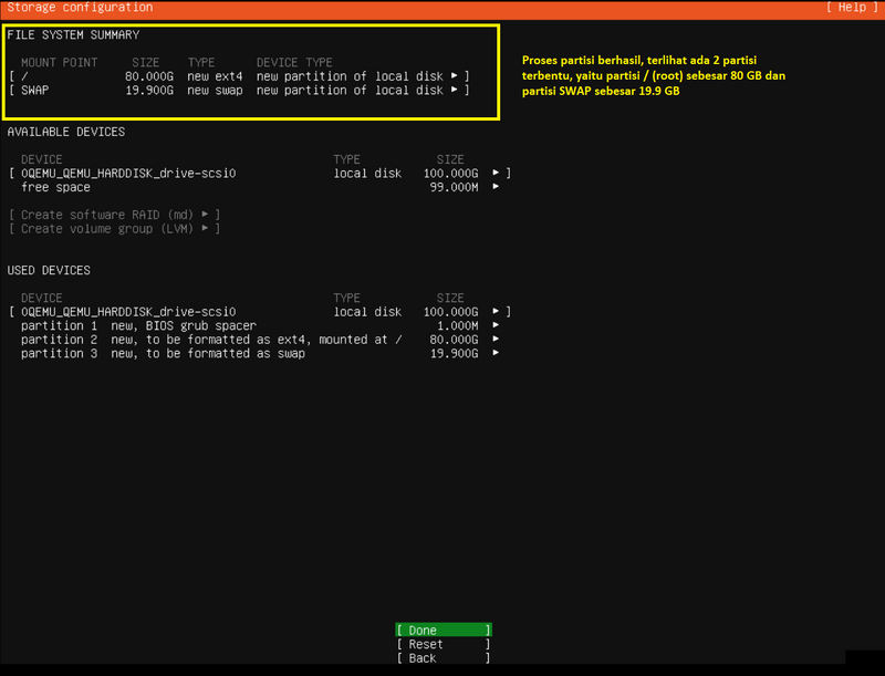 partisi menjadi 2, yaitu untuk root (/) dan swap. untuk partisi root kurang kebih 80% dari seluruh kapasitas disk, sedangkan untuk swap direkomendasikan 2 kali kapasitas RAM yang digunakan server, misalkan RAM server adalah 16 GB, maka kapasitas partisi SWAP idealnya adalah 32 GB.