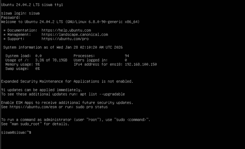 Jika sudah muncul tampilan seperti pada gambar berikut, maka proses instalasi Ubuntu server sudah selesai dan berhasil dilaksanakan.